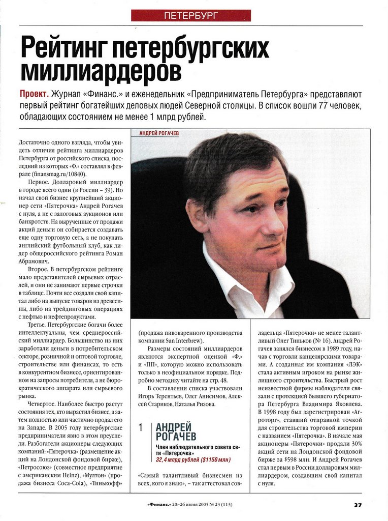 «Самый талантливый бизнесмен из всех, кого я знаю», — так аттестовал совладельца «Пятерочки» не менее талантливый Олег Тиньков (№ 16). Андрей Рогачев занялся бизнесом в 1989 году, начав с торговли канцелярскими товарами. А созданная им компания «ЛЭК» стала активным игроком на рынке жилищного строительства. Быстрый рост неизвестной фирмы наблюдатели связали с протекцией бывшего губернатора Петербурга Владимира Яковлева. В 1998 году был зарегистрирован «Агроторг», ставший отправной точкой для строительства торговой империи с названием «Пятерочка». В начале мая акционеры «Пятерочки» продали 30% акций сети на Лондонской фондовой бирже за $598 млн. И Андрей Рогачев стал первым в России долларовым миллиардером, создавшим свой капитал с нуля.