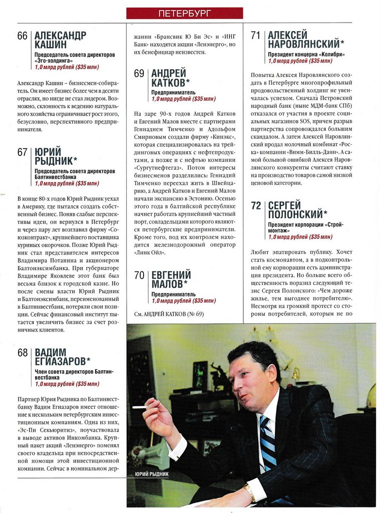 «Вы делаете ошибку», — сказал председатель правления Балтонэксимбанка Сергей Бажанов президенту банка Юрию Рыднику (№ 67), когда тот в 1999 году решил назначить другого главу правления — Вадима Зингмана. И оказался прав. Весной того же года при помощи Банкирского дома «Санкт-Петербург» Сергей Бажанов купил Леспромбанк, переименовал банк в Международный банк Санкт-Петербурга и увел туда часть клиентов «Балтонэксима». Еще через несколько лет он выкупил долю партнеров. Теперь работающие активы банка Сергея Бажанова составляют 12,5 млрд рублей. У банка Юрия Рыдника (теперь он называется Балтинвестбанк) — почти втрое меньше.