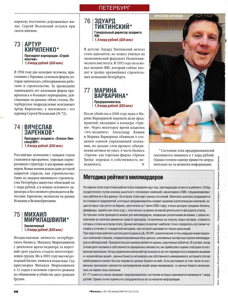 В 1994 году два молодых человека, приехавшие с Украины, основали фирму, которая занималась субподрядными работами в строительстве. За прошедшие одиннадцать лет маленькая фирма превратилась в большую корпорацию, действующую на рынках обеих столиц. Петербургское подразделение возглавляет Артур Кириленко, а московское — его партнер Сергей Полонский (№ 72).