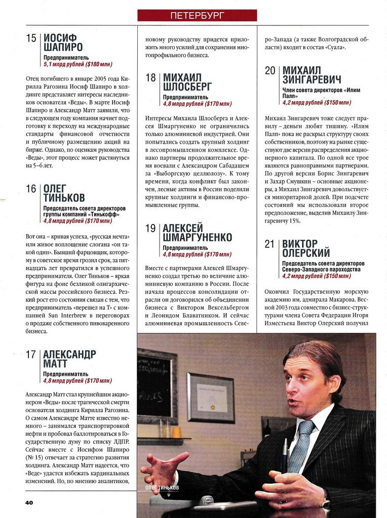 Четвертое. Наиболее быстро растут состояния тех, кто вырастил бизнес, а затем полностью или частично продал его на Западе. В 2005 году петербургские предприниматели явно в этом преуспели. Разбогатели акционеры следующих компаний: «Пятерочка» (размещение акций на Лондонской фондовой бирже), «Петросоюз» (совместное предприятие с американским Heinz), «Мултон» (продажа бизнеса Coca-Cola), «Тинькофф» (продажа пивоваренного производства компании Sun Interbrew).