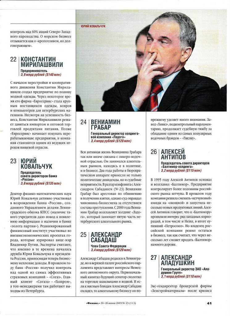 Еще один совладелец «пропрезидентского» банка «Россия». См. ЮРИЙ КОВАЛЬЧУК (№ 23) и НИКОЛАЙ ШАМАЛОВ (№ 64)